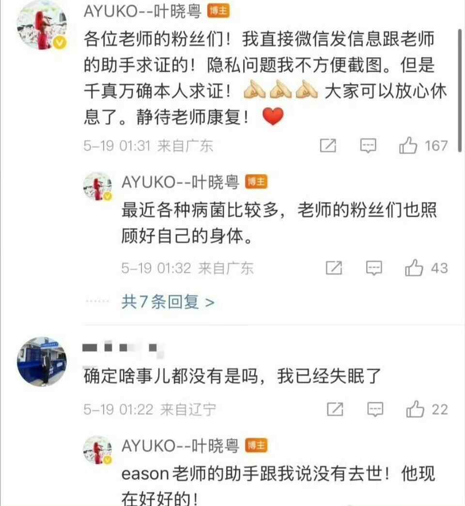 19日凌晨1点18分,歌手叶晓粤在微博发文提到,陈奕迅去世是假新闻,“Eason老师的粉丝们别担心!”她提到,因为朋友告诉自己,自媒体说陈奕迅去世,“吓得我赶紧和老师的助手求证,他说新闻是假的,Eason老师现在人好好的!”更气愤表示,自媒体造谣毫无底线,恶心至极,其心可诛。