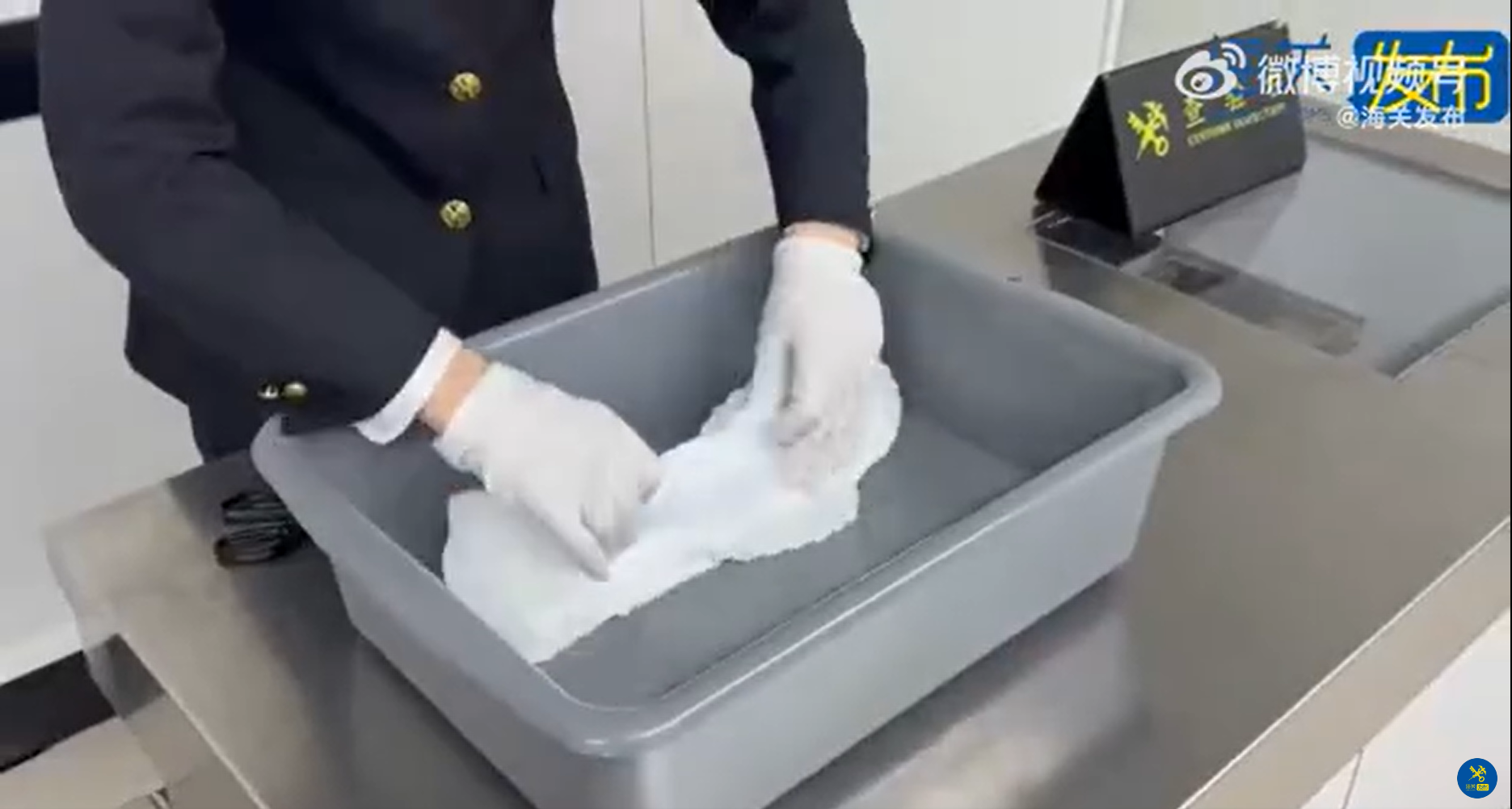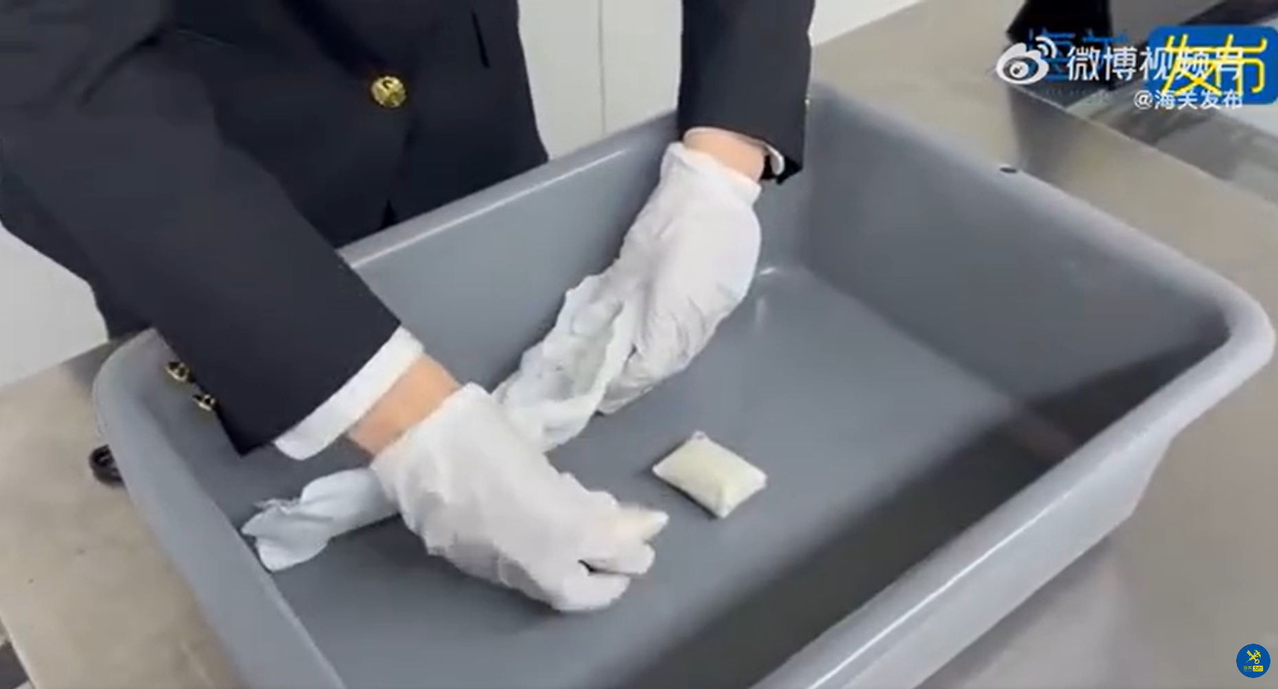 经进一步检查,在该旅客身穿的卫生巾内查获透明包装袋2个,包装袋中各藏匿无色宝石一批。后经深圳海关工业品检测中心鉴定,该批无色宝石为合成钻石戒面。目前,海关已对当事人作立案处理。