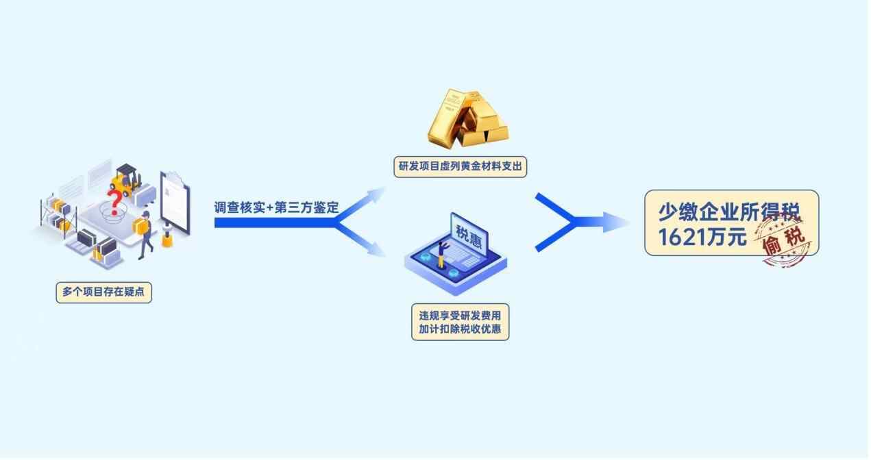 近期,国家税务总局深圳市税务局稽查局根据税收大数据及相关涉税线索,依法查处深圳金斯达应用材料有限公司违规享受研发费用加计扣除税收优惠偷税案件。经查,该公司通过在研发费用中虚列黄金材料支出等手段进行虚假纳税申报,违规享受研发费用加计扣除税收优惠,少缴企业所得税1621.16万元,同时该公司还存在其他少缴税款行为。针对其违法事实,稽查部门依法作出追缴税款、加收滞纳金并处罚款共计3618.15万元的处理处罚决定。