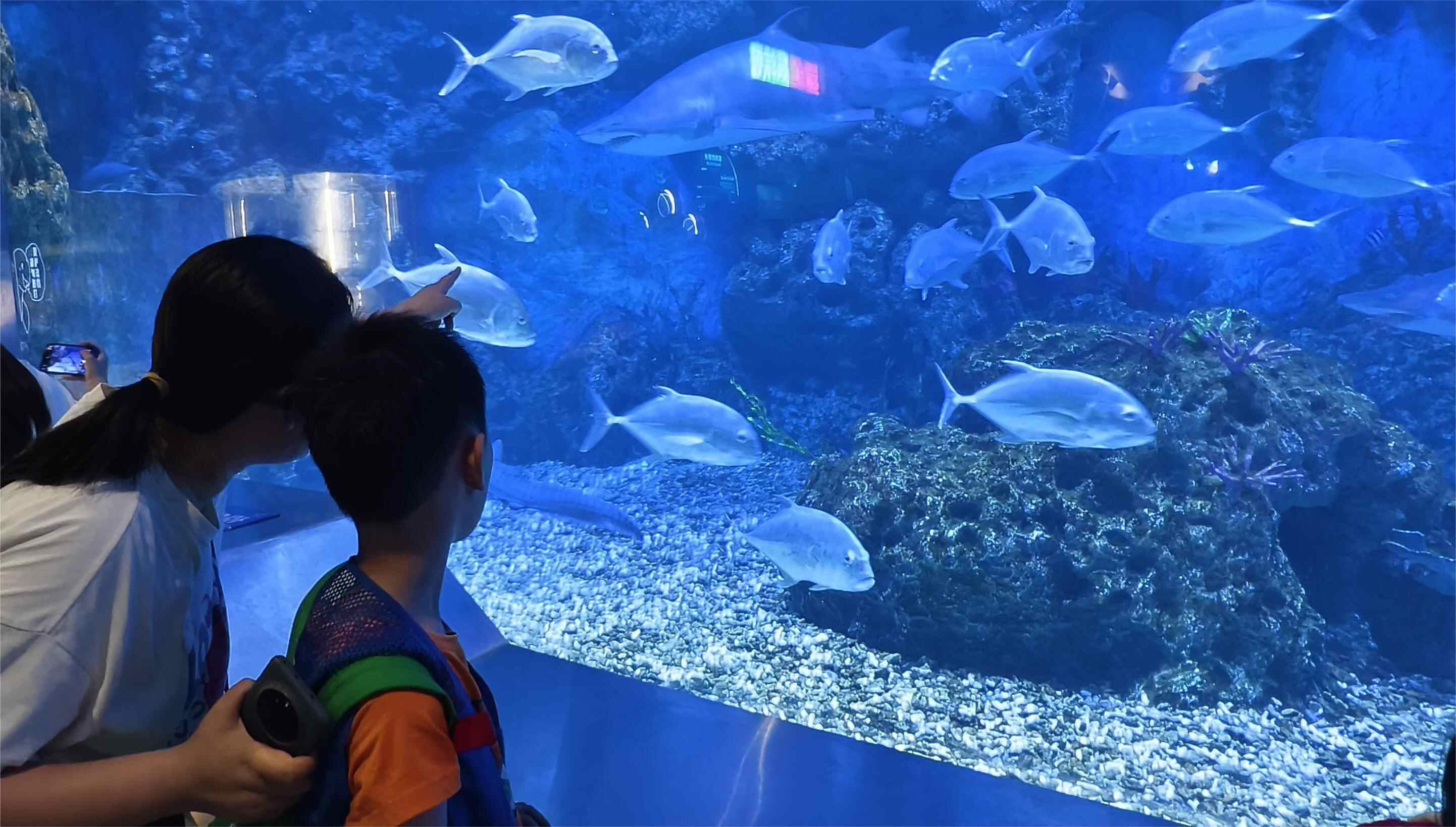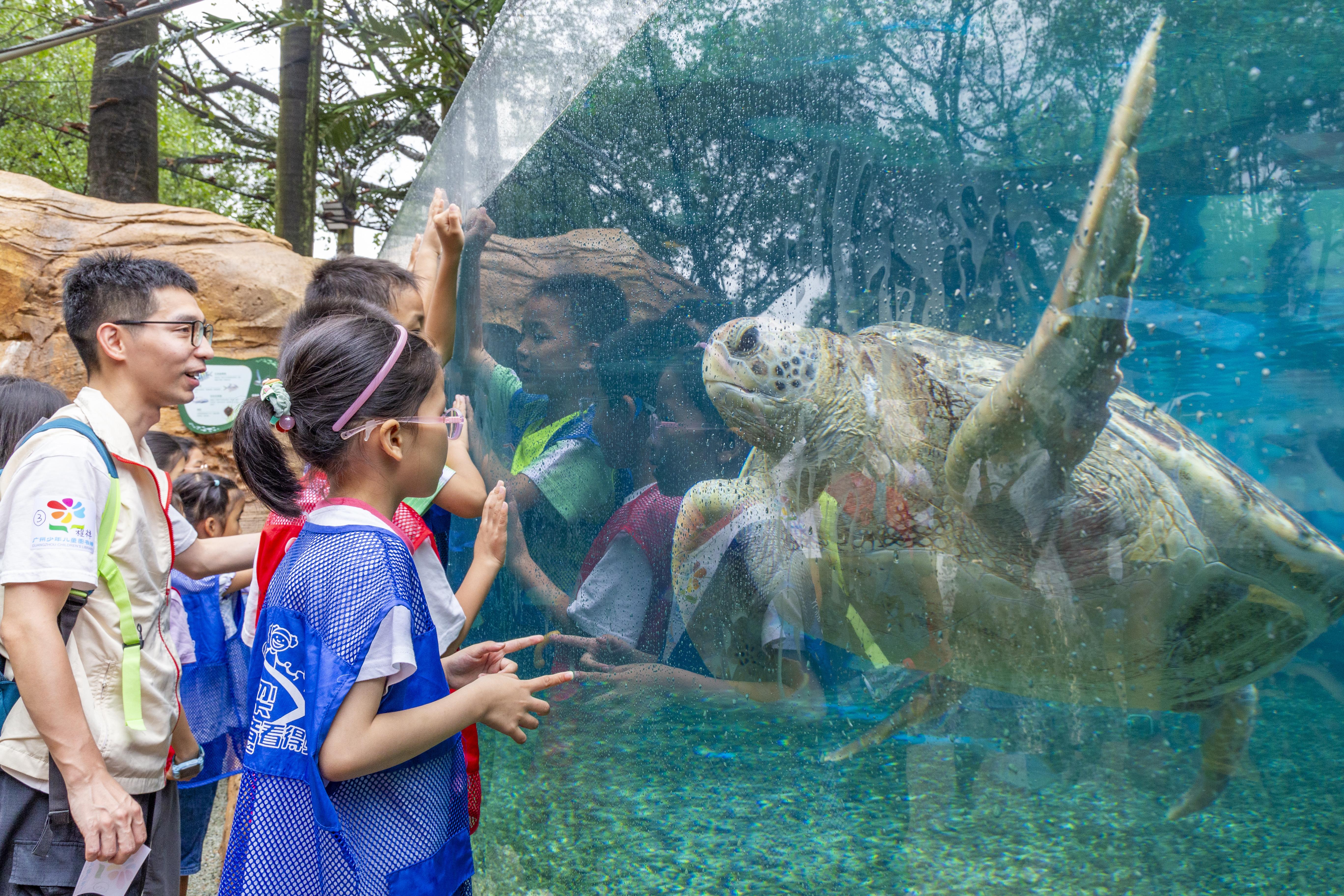 在海洋馆内的海龟之家,孩子们纷纷与国家一级保护动物绿海龟等超大海龟互动合影。海星触摸体验环节,更是让孩子们直观地感受到海洋生物的奇妙。