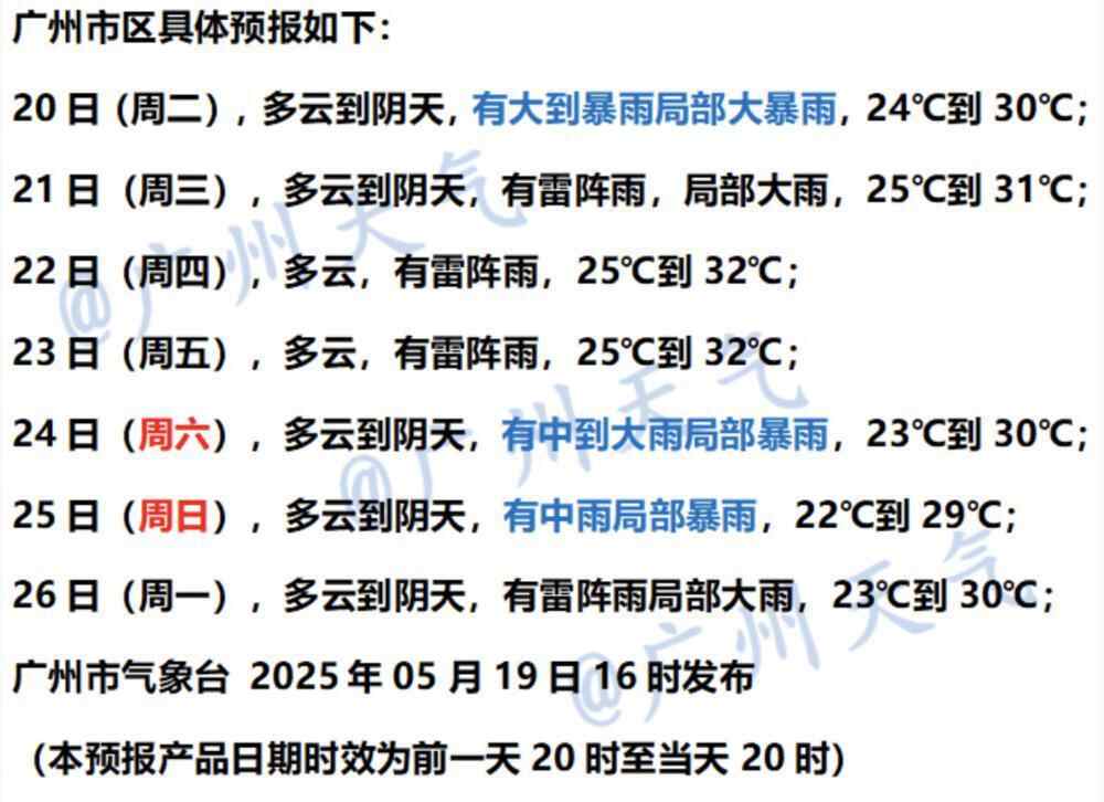 根据广州市气象台5月19日傍晚的预报,预计19日夜间至20日,广州仍有大到暴雨局部大暴雨,并伴有短时强降水、雷电、6~8级局部9~10级短时大风等强对流天气。