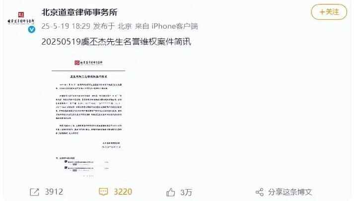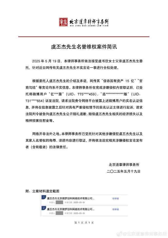 5月19日,北京道章律师事务所晒出名誉维权案件声明,称依法接受女星虞书欣爸爸虞丕杰先生委托,对网传其“侵吞国有资产15亿”“官商勾结”等不实言论进行维权取证,将起诉具有严重侵权行为的实名认证主体。
