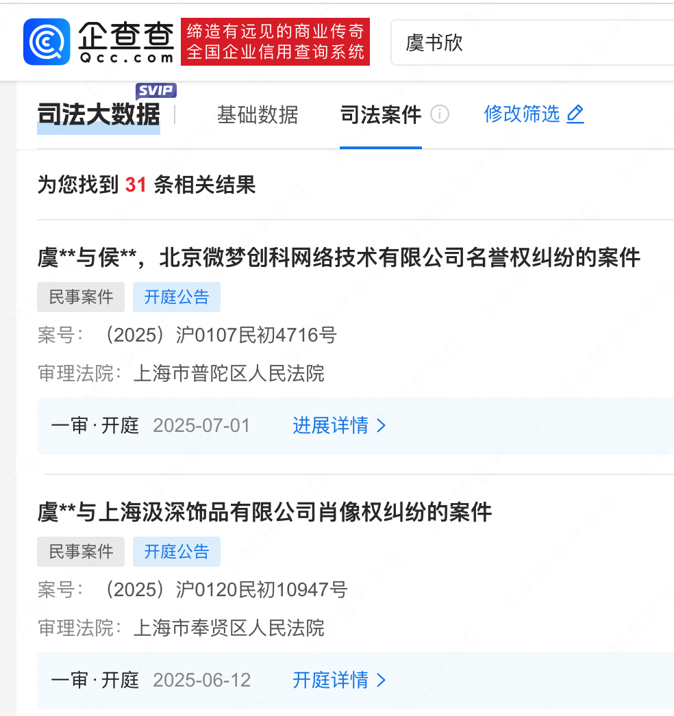 企查查APP显示,近日,虞书欣多起维权将开庭。