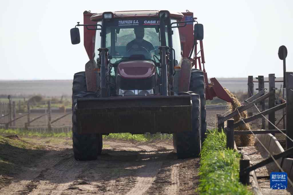 5月14日,工作人员在阿根廷潘帕斯草原莱因迪亚纳牧场驾驶喂食机投食。新华社记者 孟鼎博 摄