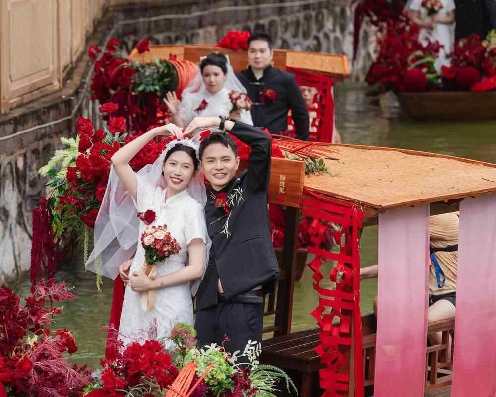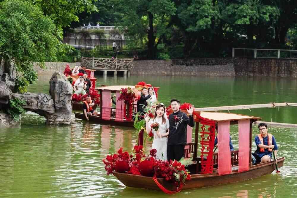 新人们过鹊桥、登婚船,泛舟水上,向岸上围观祝福的人们挥手致意,这是婚礼过程中最具有广东特色的一个环节。广东临海而多水,疍民世代以舟楫为家,婚礼迎亲则以船代轿、颠船贺喜,与大众熟知的陆上婚仪迥然不同,极具岭南水乡特色。