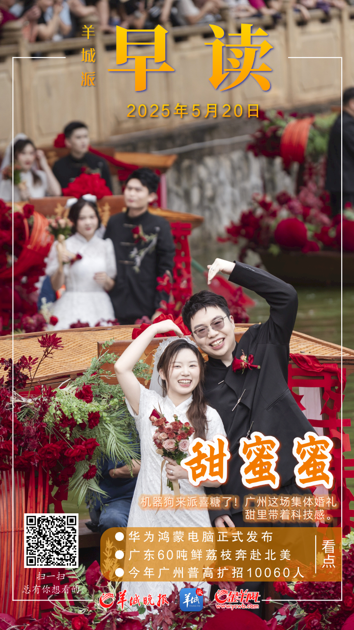 ◆南粤青年喜结良缘,千对新人共植“幸福树”。详情-->机器狗来派喜糖了!广州这场集体婚礼甜里带着科技感。详情-->