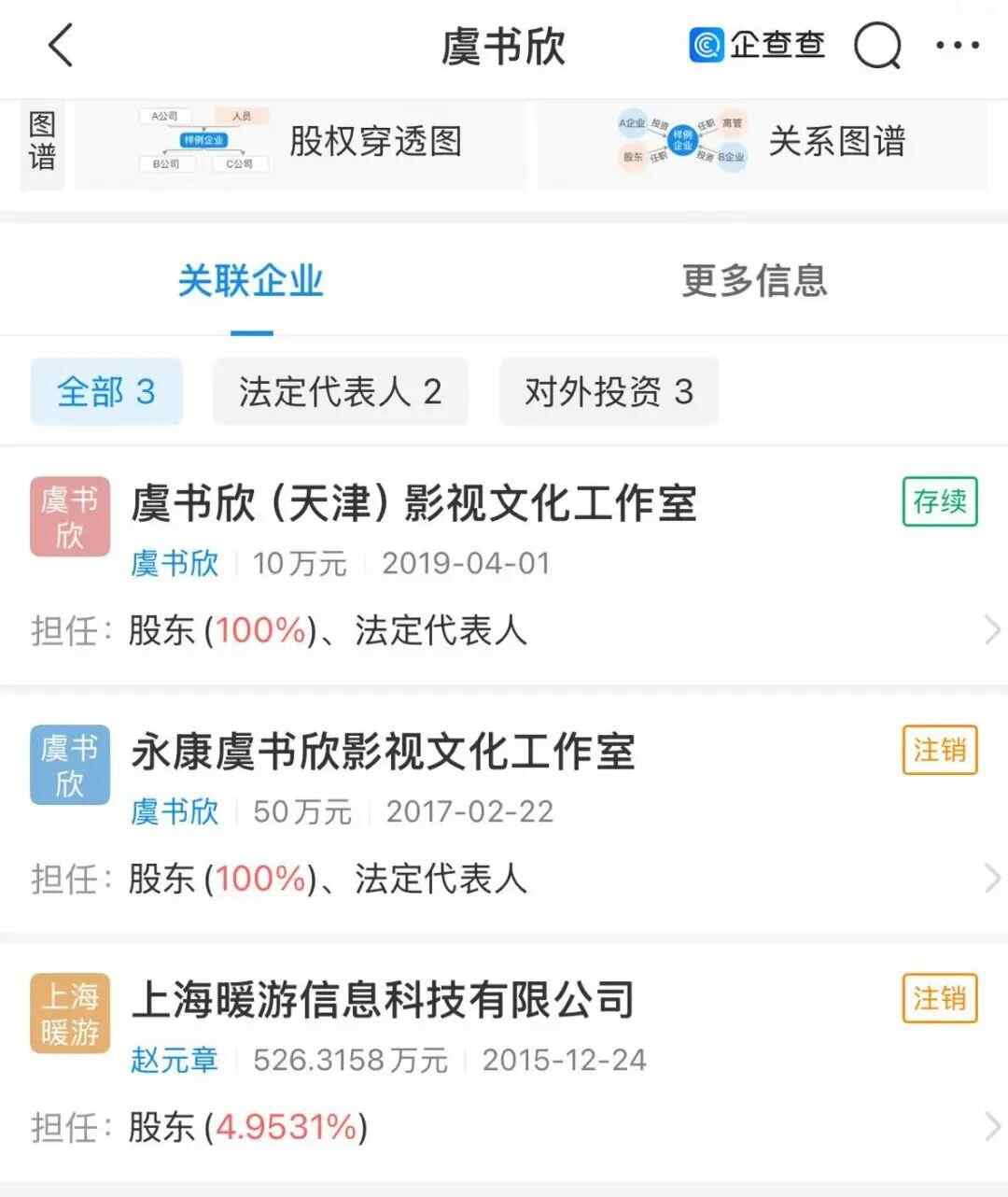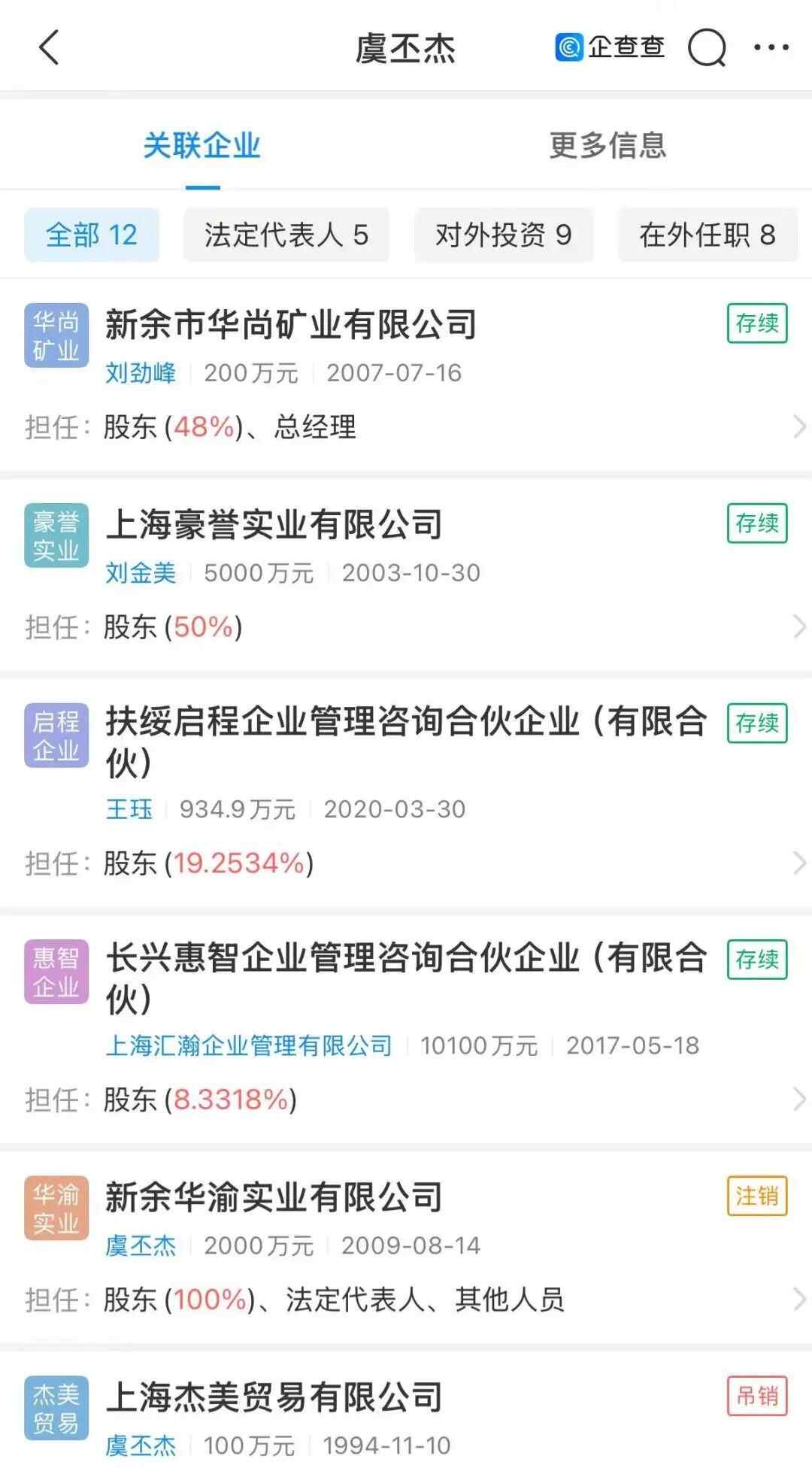 据企查查信息显示,虞书欣关联3家公司,仅虞书欣(天津)影视文化工作室存续,虞书欣担任投资人持股100%。其父亲虞丕杰名下关联12家公司,4家为存续状态,其中持有涉争议的新余市华尚矿业有限公司48%股权,并担任总经理。虞书欣母亲刘金美名下关联7家公司,多家为吊注销状态,仅1家存续。