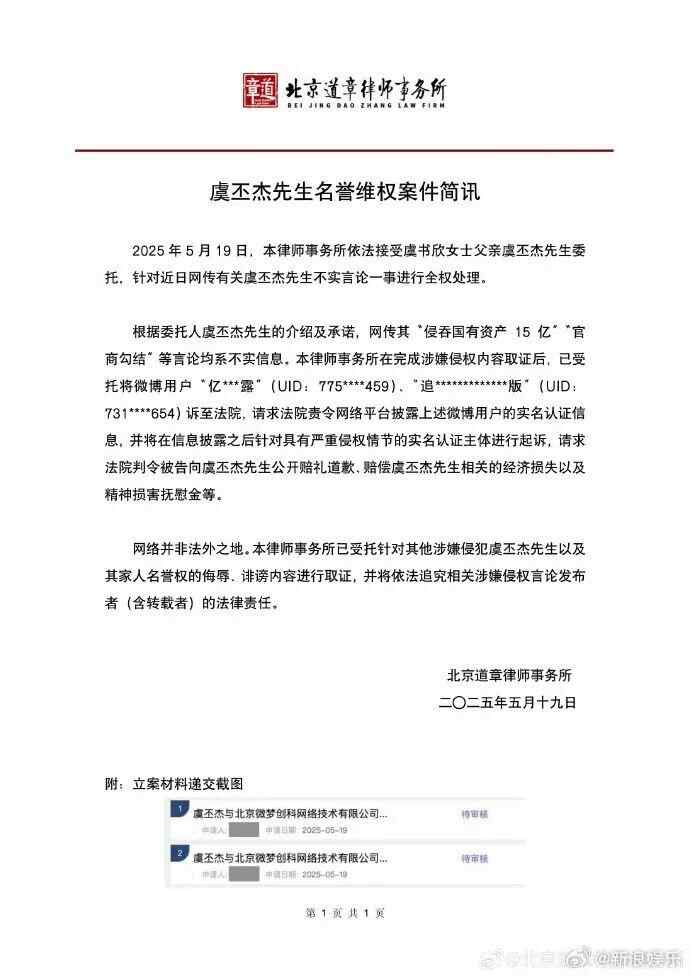 5月19日,北京道章律师事务所晒出名誉维权案件声明,称依法接受虞书欣爸爸虞丕杰先生委托,对网传其“侵吞国有资产15亿”“官商勾结”等不实言论进行维权取证,将起诉具有严重侵权行为的实名认证主体。