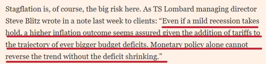文章认为,滞胀才是最大的风险。正如一家知名投资研究公司董事总经理史蒂夫·布利茨上周在给客户的报告中所写:“即使出现温和的经济衰退,考虑到关税加上不断扩大的预算赤字,通胀上升似乎已成定局。如果赤字不缩减,单靠货币政策无法扭转这一趋势。”