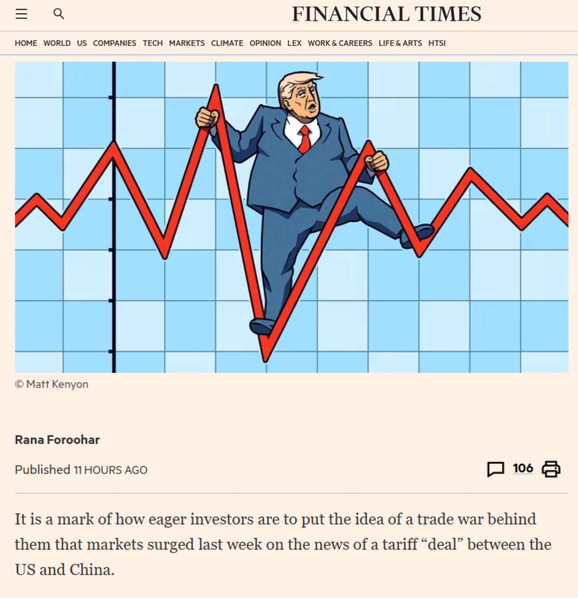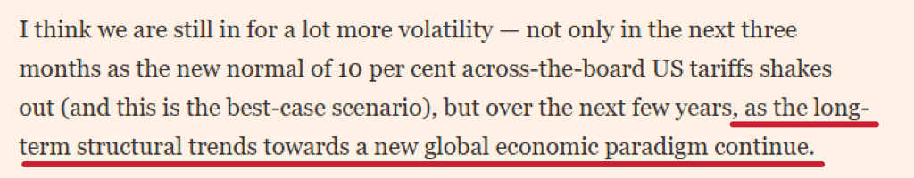 然而,文章对投资者过度乐观的情绪提出了警示,认为市场可能面临更大的波动——不仅在未来三个月内,随着美国全面征收10%关税的新常态逐渐显现。而且在未来几年内,随着全球经济新范式的长期结构性趋势持续发展,波动也将进一步加剧。