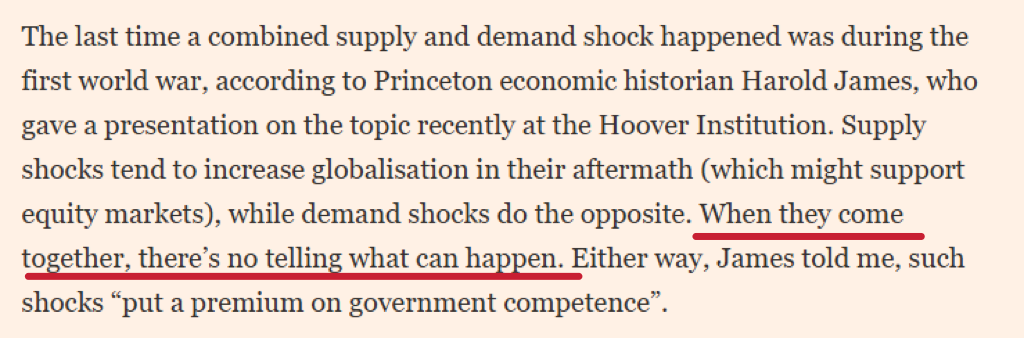 文章注意到普林斯顿大学经济史学家哈罗德·詹姆斯对这一问题的观点。他指出,上一次供给和需求共同冲击发生在第一次世界大战期间。供给冲击往往会在战后加剧全球化,而需求冲击则会产生相反的效果。当它们结合在一起时,后果难以预料。
