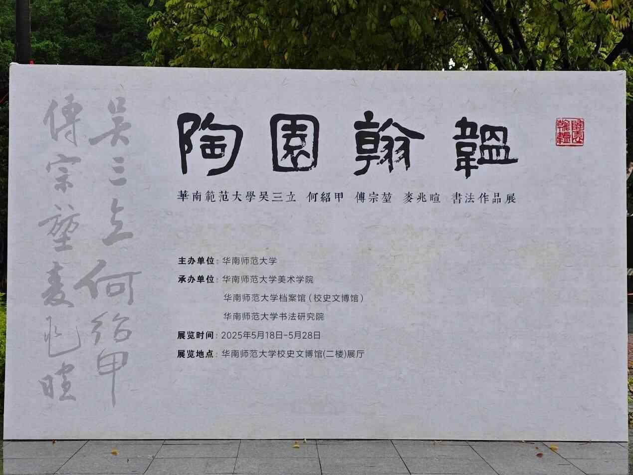5月18日,华南师范大学书法研究院成立,同日,由华南师范大学美术学院与校史文博馆联合举办的“华南师范大学吴三立、何绍甲、傅宗堃、麦兆暄书法作品展”开幕,共展出40余件书法作品。