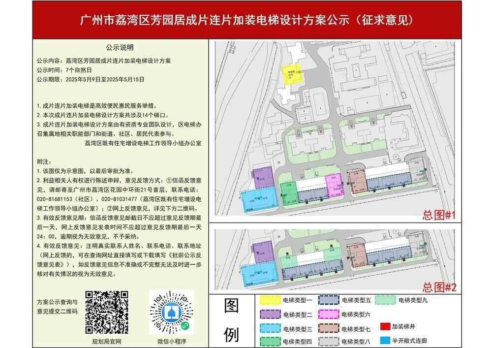 近日,广州市荔湾区芳园居小区成片连片加装电梯设计方案完成批前公示,覆盖14个梯口,标志着这一老旧小区居民期盼多年的“电梯梦”圆梦可期。此次创新实践大幅压缩审批流程,加梯效率显著提升,14个梯口预计在今年内开工建设,惠及居民超460户。