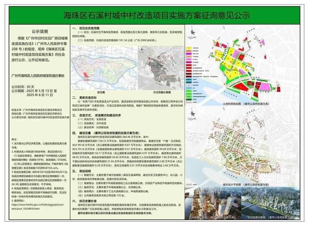 5月15日,广州市海珠区石溪村城中村改造项目实施方案征询意见公示,标志着这一旧改项目终于迎来实质性进展。