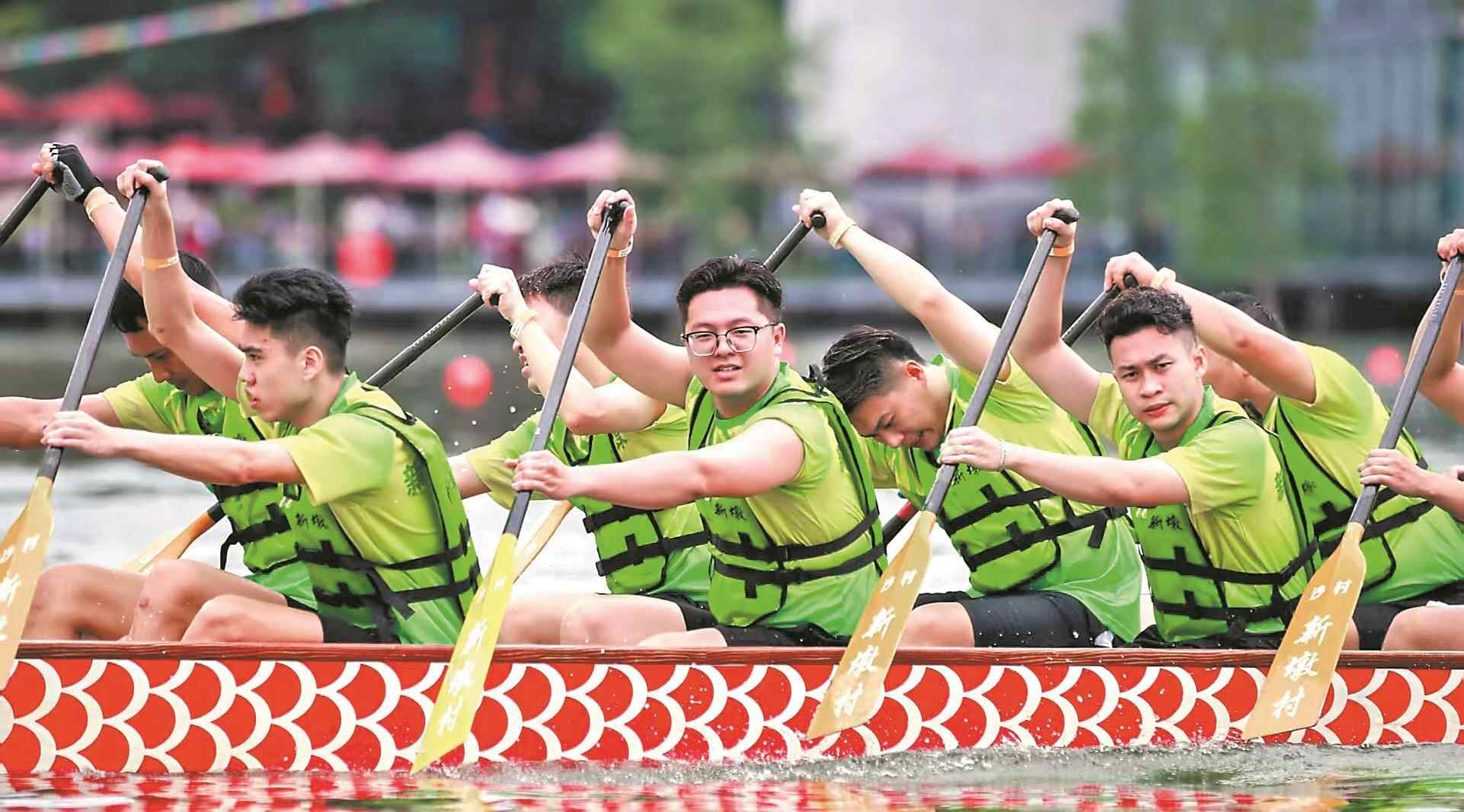 发令枪响,麓湖瞬间沸腾。一条条龙舟如离弦之箭冲出起点,桨手躬身挥臂,船桨与水面碰撞激起层层白浪,在湖面上勾勒出气势磅礴的运动轨迹;鼓手持槌奋力击鼓,铿锵有力的鼓点成为队伍协同作战的指挥号角,声浪穿透麓湖上空……龙舟健儿们将龙舟竞渡的速度与力量之美展现得淋漓尽致,加油助威声、呐喊喝彩声响彻湖面(见图)。