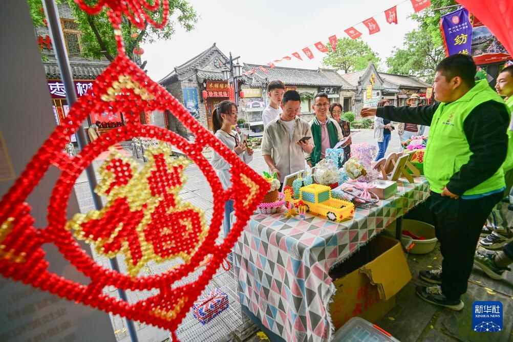 5月17日,在山东省青州古城景区,爱心人士在购买残疾人制作的手工艺品。