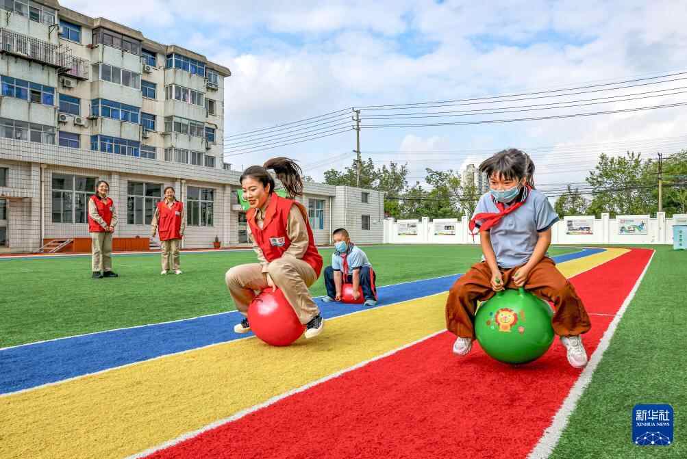 5月16日,在江苏省扬州市江都区特殊教育学校,青年志愿者和智力障碍学生一起做“羊角球”蹦蹦跳游戏。