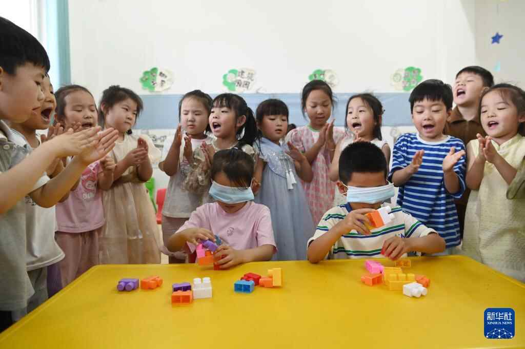 5月16日,在河南省沁阳市第一幼儿教育集团白庄村幼儿园,两名小朋友戴着眼罩做拼插建构游戏。