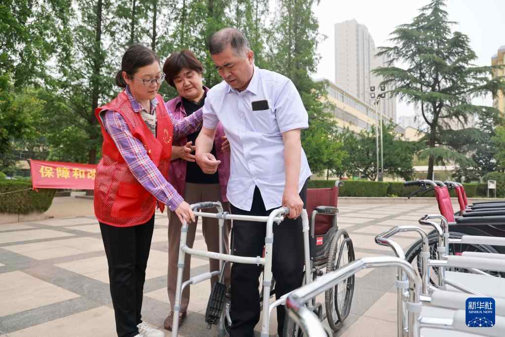 5月16日,在山东省临沂市兰山区银雀山街道,社区志愿者在帮助残疾人练习使用免费发放的行走辅助器械。