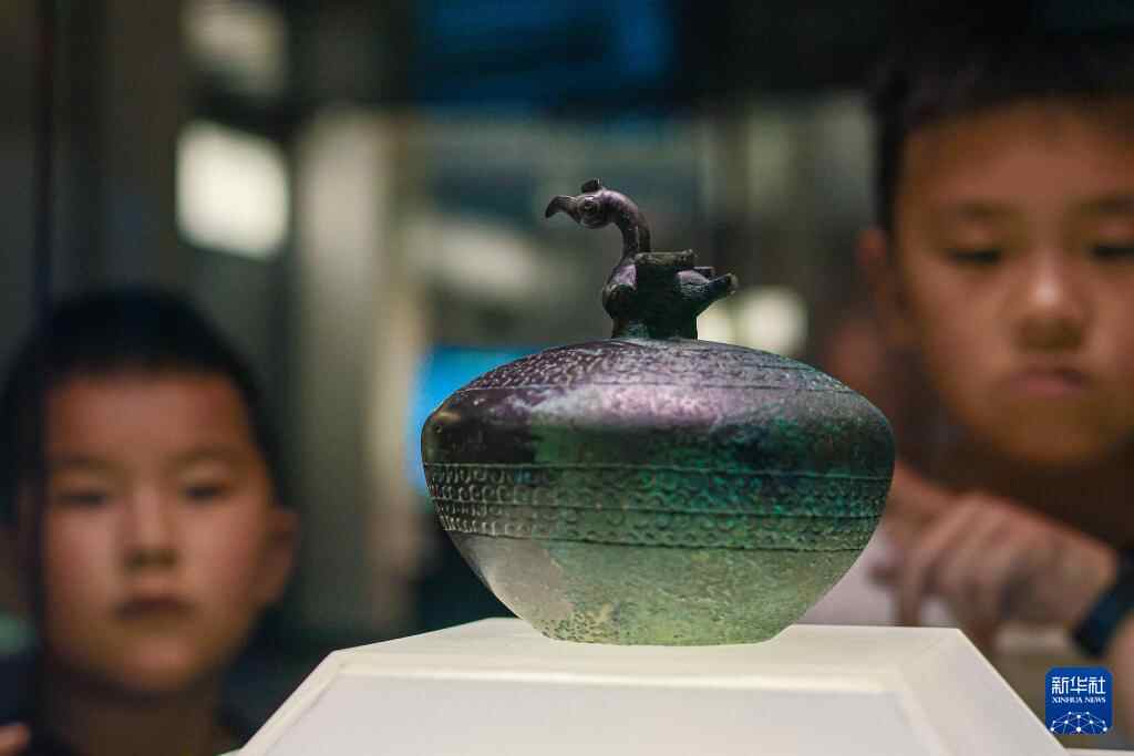 5月17日,市民在山东省枣庄市博物馆观看青铜器展品。