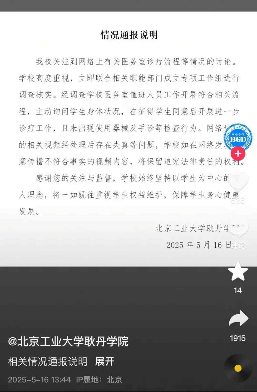 “生理期不舒服去校医室开假条,被要求脱裤子证明。”5月15日,有网友发布视频称,北京工业大学耿丹学院一名女生在生理期不舒服时前往医务室请病假,被要求脱裤子以证明其身体状况。
