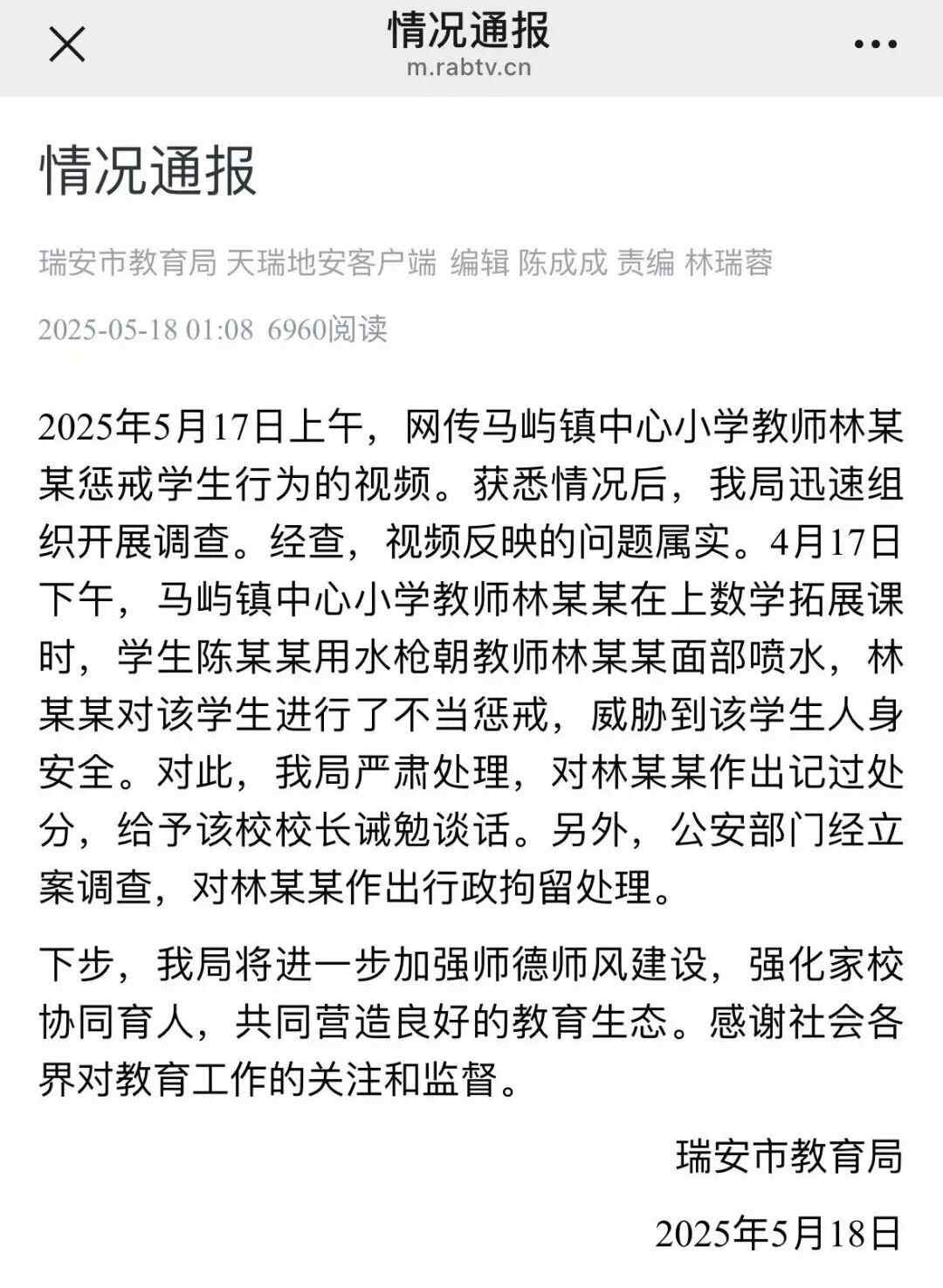 2025年5月17日上午,网传马屿镇中心小学教师林某某惩戒学生行为的视频。获悉情况后,我局迅速组织开展调查。经查,视频反映的问题属实。