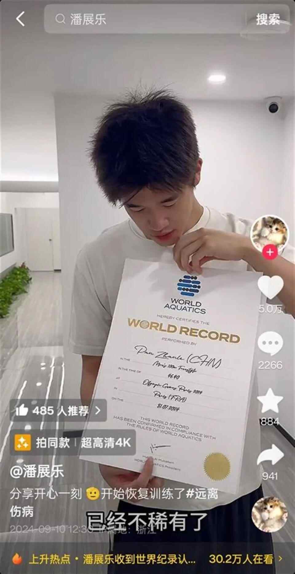 2024年9月,奥运冠军潘展乐在社交平台发布视频,宣布收到了游泳世界纪录证书。证书上用英文写道:“潘展乐在巴黎奥运会创造了男子100米自由泳世界纪录,时间为46秒40。”在展示证书期间,潘展乐不忘“凡尔赛”一波,表示自己已经拿到两个世界纪录证书了,“已经不稀有了,上面的数字才稀有。”