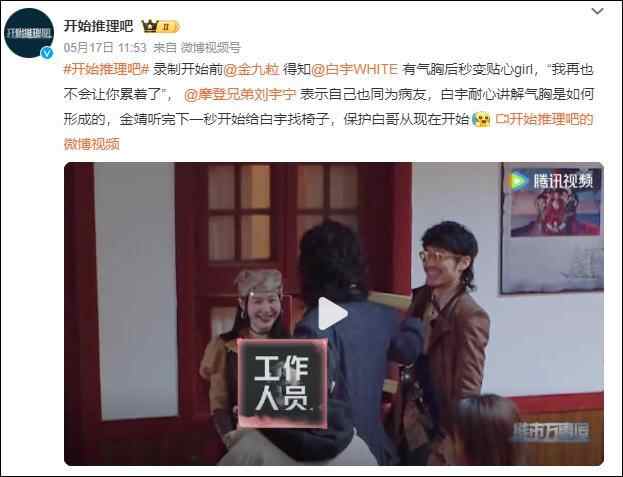 录制开始前金靖得知白宇有气胸后秒变贴心girl,“我再也不会让你累着了”, 刘宇宁表示自己也同为病友,白宇耐心讲解气胸是如何形成的,自述因气胸接受过六次手术,金靖听完下一秒开始给白宇找椅子。