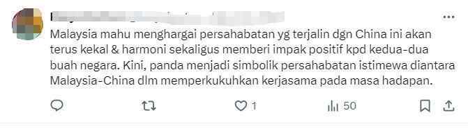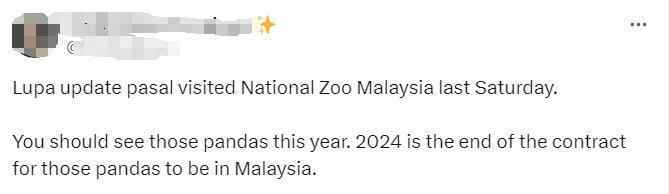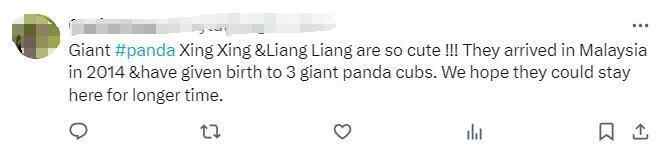 “上周六我去参观了马来西亚国家动物园。今年大家一定赶紧去看大熊猫。2024 年,‘兴兴’和‘靓靓’在马来西亚的租借合同可能就要到期了。”
