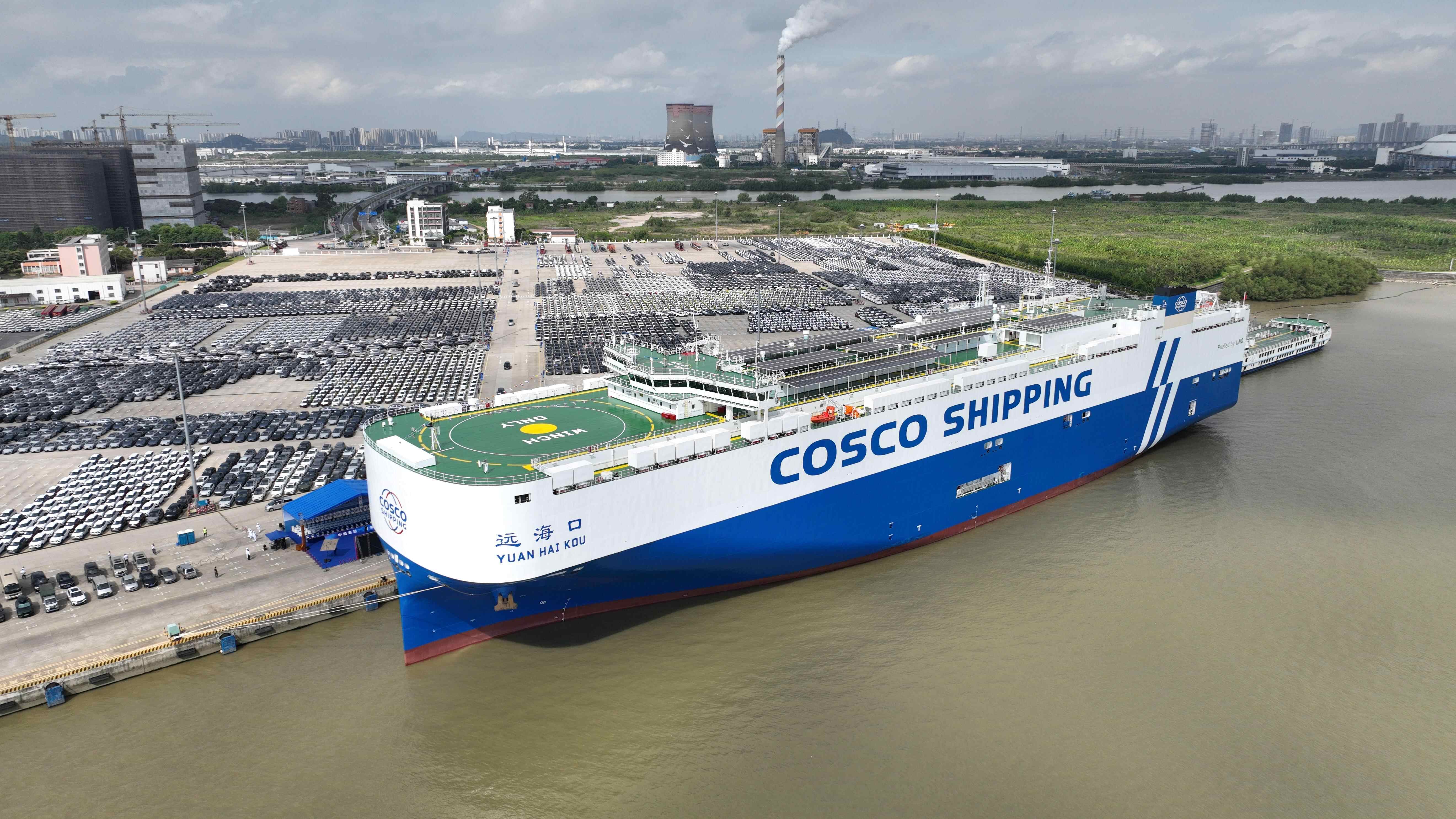 5月15日,我国最大光伏能源+LNG(液化天然气)双燃料汽车运输船“远海口”轮在广州南沙港海嘉汽车码头命名并交付首航,搭载约4000台国产品牌汽车驶向欧洲。