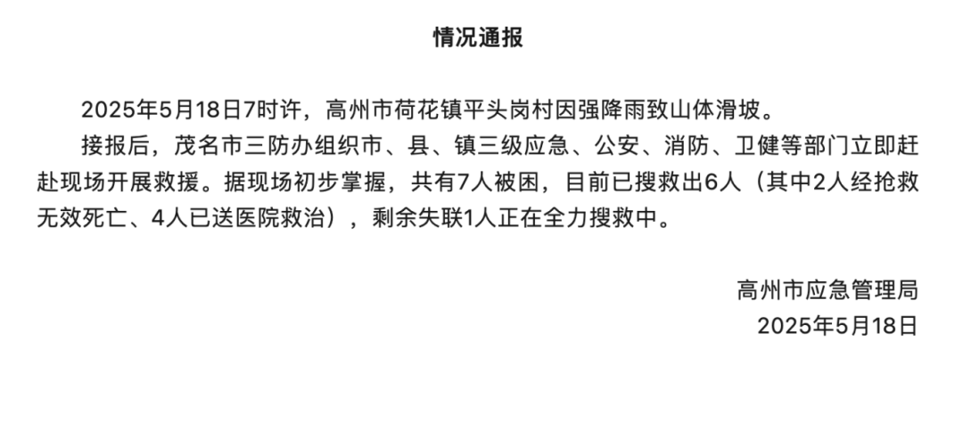 5月18日,广东省茂名市高州市应急管理局发布一则情况通报,全文如下: