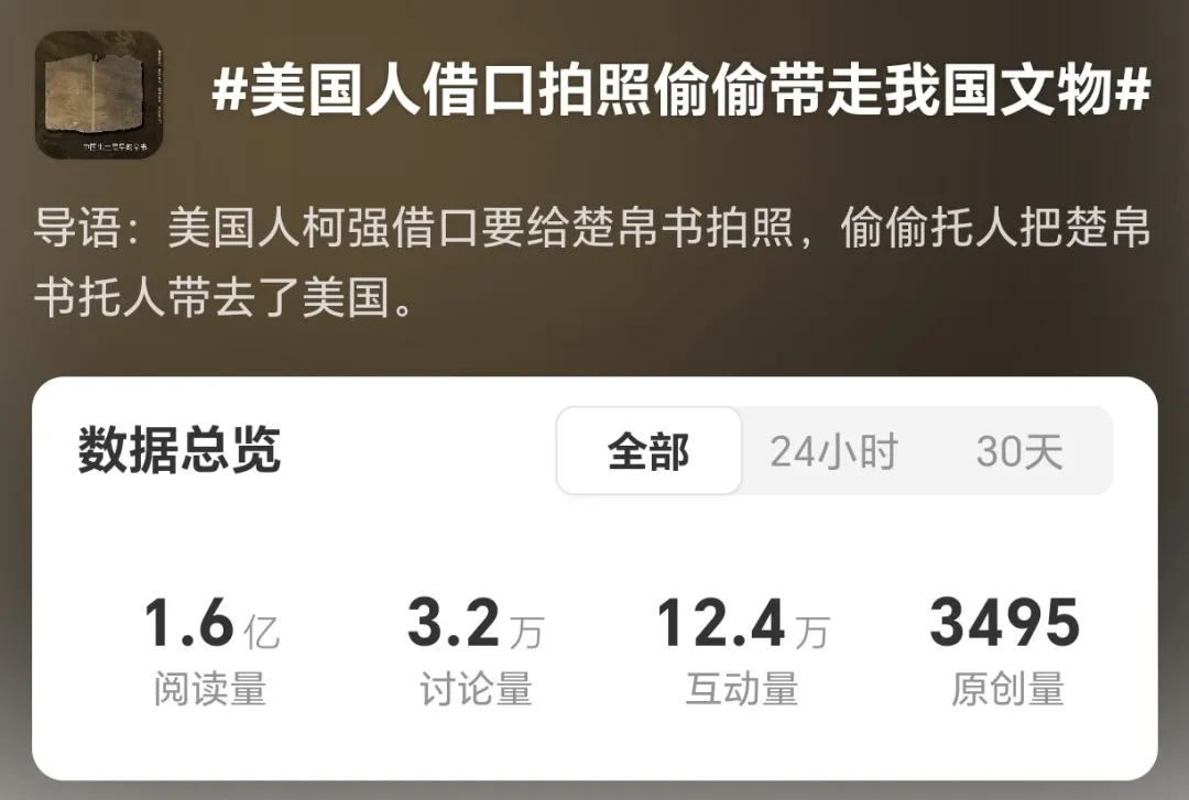 在2024年9月10日举行的《帛书传奇》启动仪式上,我方首次完整披露了子弹库帛书流失美国的关键证据,引发国际舆论高度关注。发布会相关内容“美国人借口拍照偷偷带走我国文物”话题词登上微博热搜主榜第1位长达15小时,并被美欧多国媒体转发和报道。