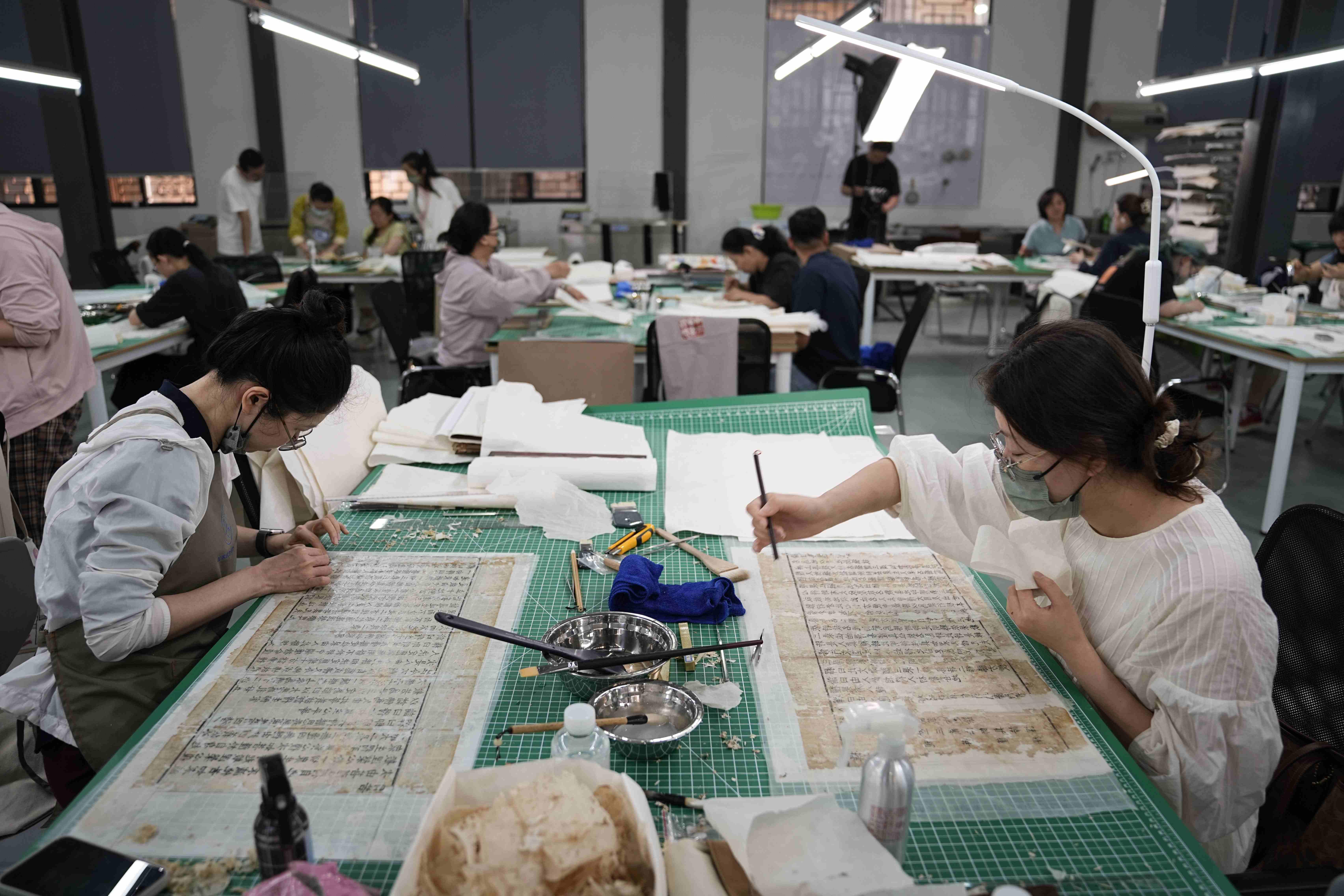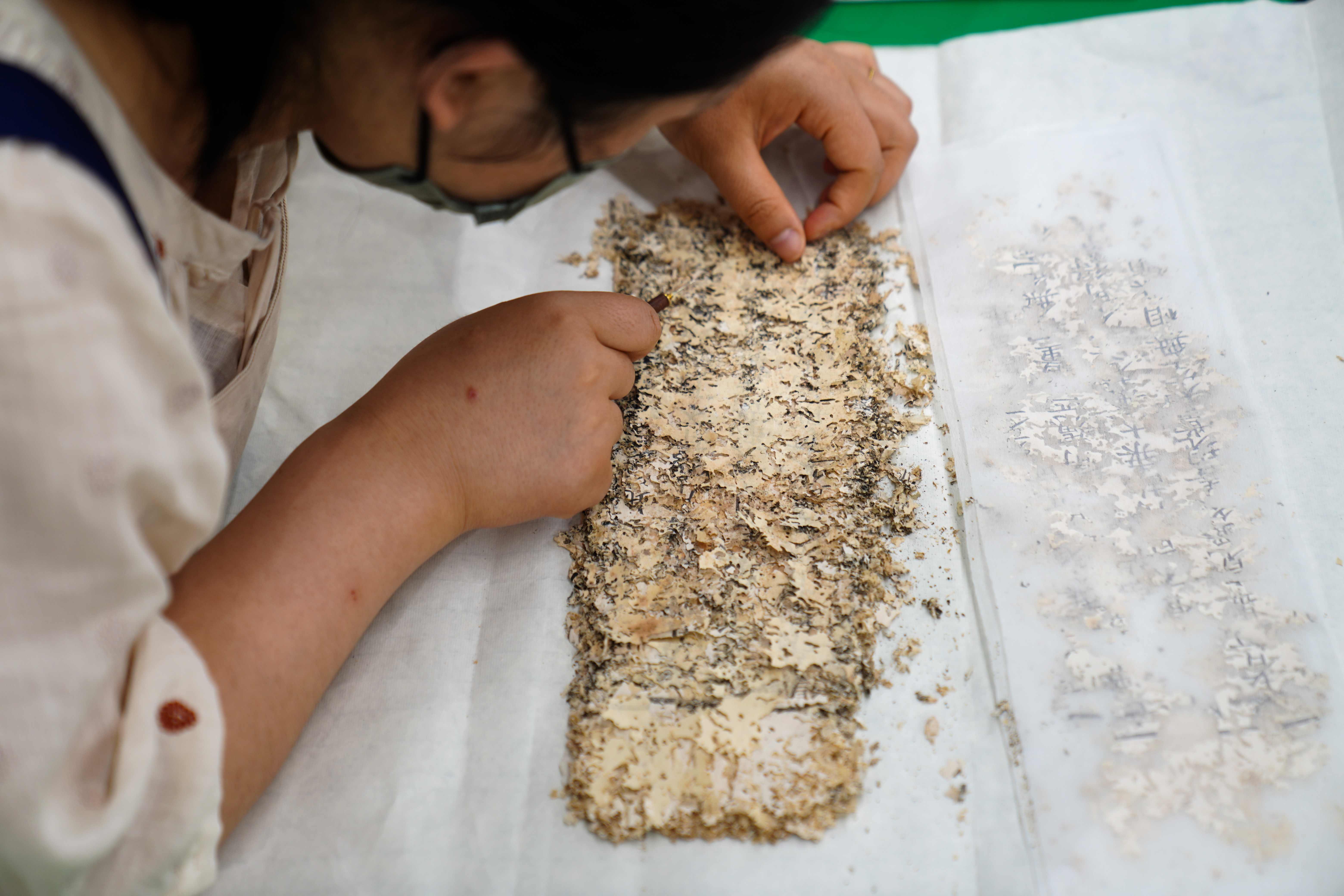 工作台上铺着泛黄的经卷,有些地方已经被虫蛀得千疮百孔,成碎片状;有些则因为受潮而粘连紧密,难以分离。专业学员们紧张而又有条不紊地进行着修复工作。记者身在其中,不敢高声言语,以免打扰这一场“与历史的对话”。