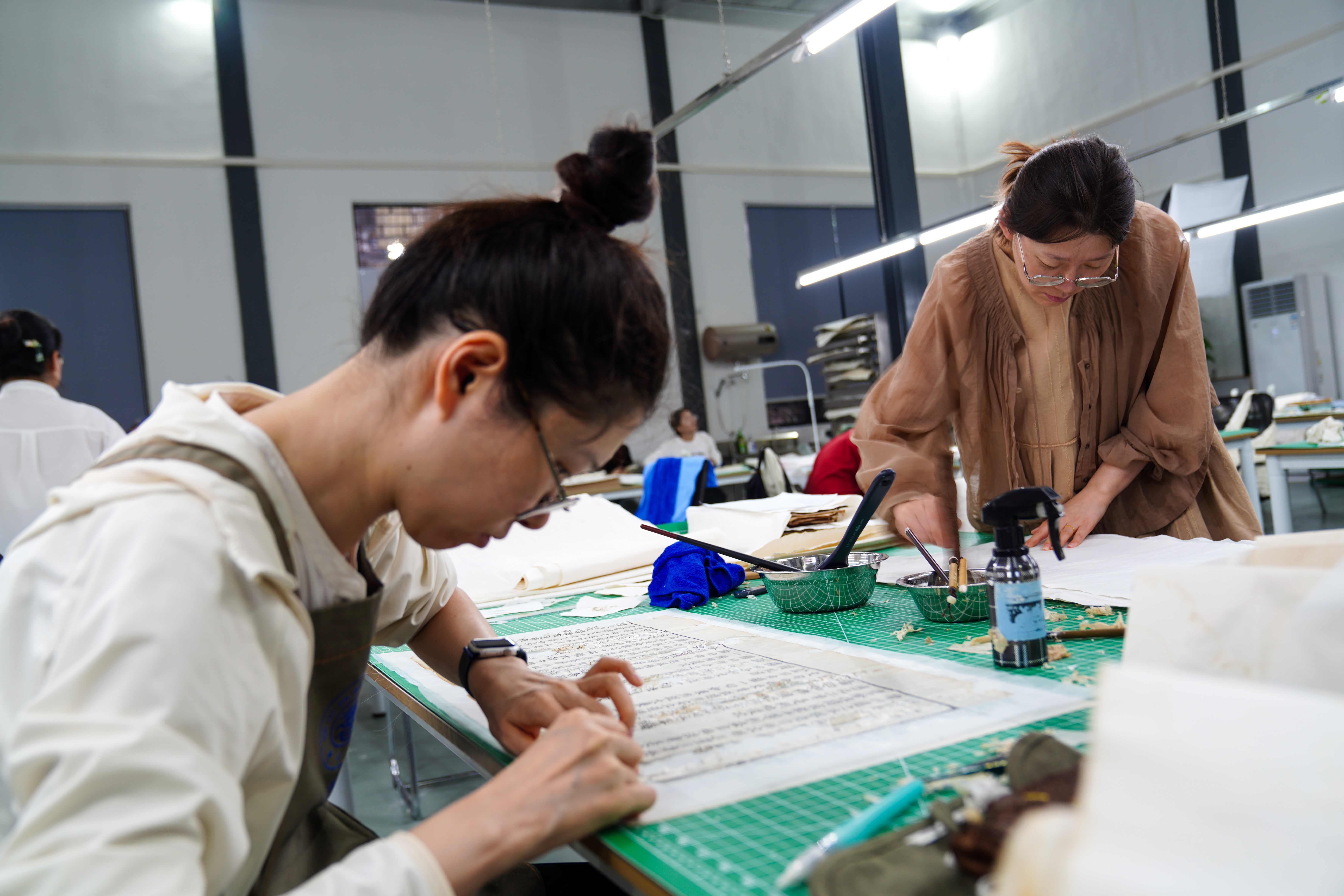 学员们手里拿着细毛笔、镊子,小心翼翼地修补破损的经卷纸张。有人用镊子轻轻挑开粘连的页角,动作很慢,生怕稍微用力就会撕坏脆弱的纸页;有人用毛笔蘸取少量清水,一点点将经卷的褶皱抹平。