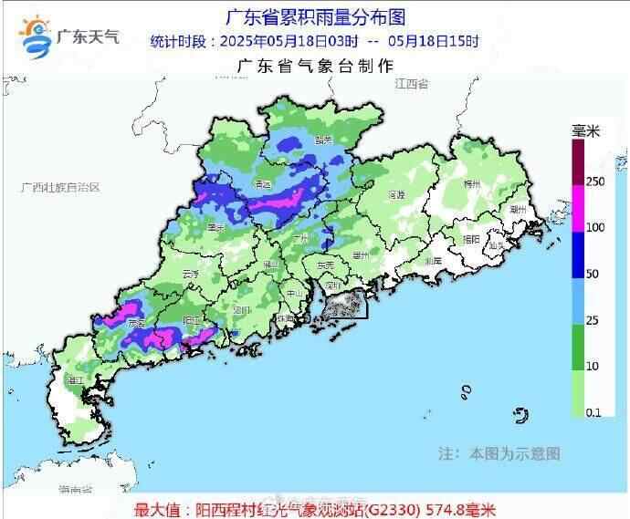 根据广东省气象部门观测和统计,5月17日夜间至18日白天,清远、茂名、肇庆北部、韶关南部、佛山、广州等市县阴天间多云,出现了大雨到暴雨,局部大暴雨或特大暴雨;粤东市县多云间阴天,局部出现了(雷)阵雨;广东其余市县多云到阴天,出现了(雷)阵雨局部暴雨。从5月17日20时至18日16时,广东有4个镇街录得超过250毫米的特大暴雨,有66个镇街录得100毫米~250毫米的大暴雨,有218个镇街录得50毫米~100毫米的暴雨,各市雨量最大的镇街有:阳江阳西县程村镇593.1毫米、茂名电白区罗坑镇249.8毫米、清远清城区飞来峡镇149毫米、肇庆怀集县冷坑镇137.1毫米。在广州,5月17日夜间至18日白天中北部地区出现大到暴雨局部大暴雨,南部地区出现中到大雨,并伴有6~8级局部9级阵风和雷电。截至18日17时,从化区鳌头镇录得广州最大累积雨量132.6毫米和最大小时雨量64.2毫米,南沙区黄阁镇录得广州最大阵风21.5米/秒(9级)。