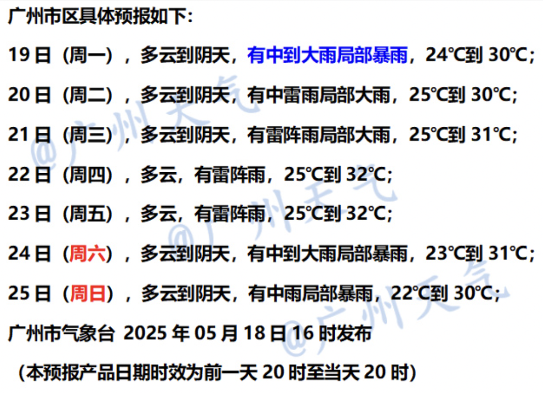 广州市气象台5月18日预计,19日至21日受副热带高压边缘多波动和低层偏南气流影响,广州有中到大雨局部暴雨,并伴有短时强降水、雷电、6~8级短时大风等强对流天气。展望未来一周广州雷雨多发,其中24日至25日受高空槽、切变线和弱冷空气影响,广州有一次中到大雨局部暴雨的降水过程。