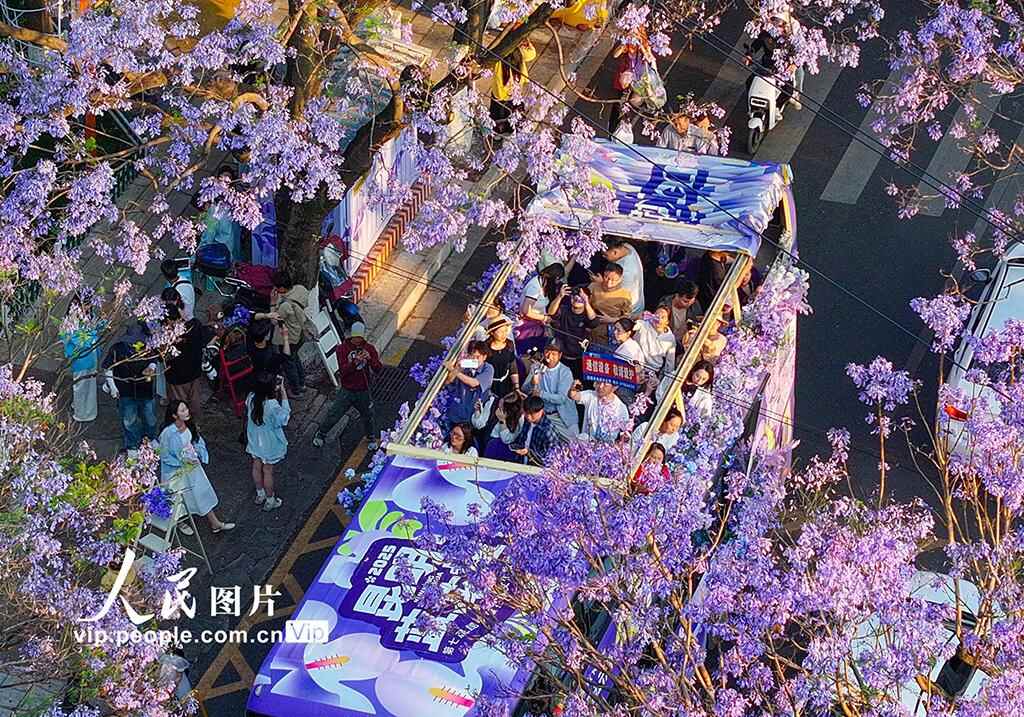 初夏时节,云南省昆明市教场中路的蓝花楹如期绽放,游客漫步于梦幻的蓝紫色街道,或仰头拍摄花枝,或在落英缤纷中留影,感受春城独有的浪漫气息。常奇摄(人民图片网)