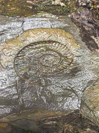 河源市东源县双江镇增坑村近日传来一条令人振奋的消息:该村90后大学生村干部赖达威在日常巡山时,当其行至万绿湖畔的增坑村珠坑片区夜珠牙(地名)古氏宗祠约1公里处的山间小道旁,意外发现一枚嵌在黑色大石块的完整的菊石化石,其直径长约10厘米。河源恐龙研究所有关工作人员称,河源之前发现的菊石化石多数嵌在松脆酥软的石块里,而这枚菊石化石却嵌在坚硬的石块中,其种属和地层年代还有待今后作出进一步的科学分析与研究。