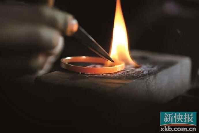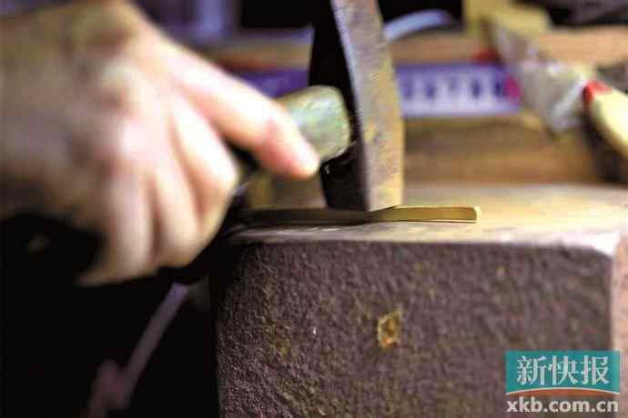■叮叮当当,叮叮当当,在这块历史悠久的敲金石上,金条被廖叔敲打成扁扁的长条,再用精准的火候焊接成环。
