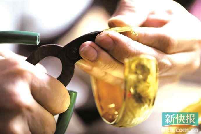 ■熔金之前,廖叔先剪下混合材质的卡扣,这样才能炼制出最纯正的黄金。