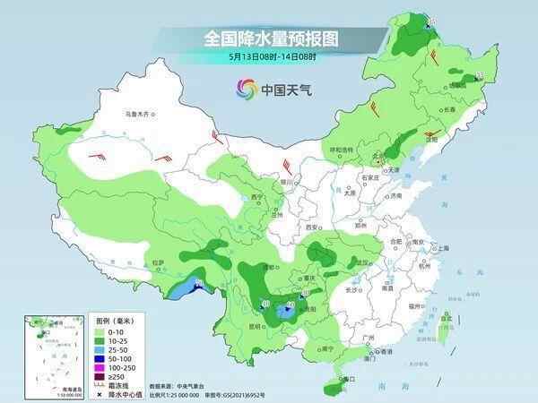 中央气象台预计,13日,内蒙古东北部、黑龙江西北部、西藏东部、川西高原、四川南部、重庆北部、云南东北部、海南岛等地部分地区有中到大雨,其中,西藏东南部、贵州西部等地部分地区有暴雨。