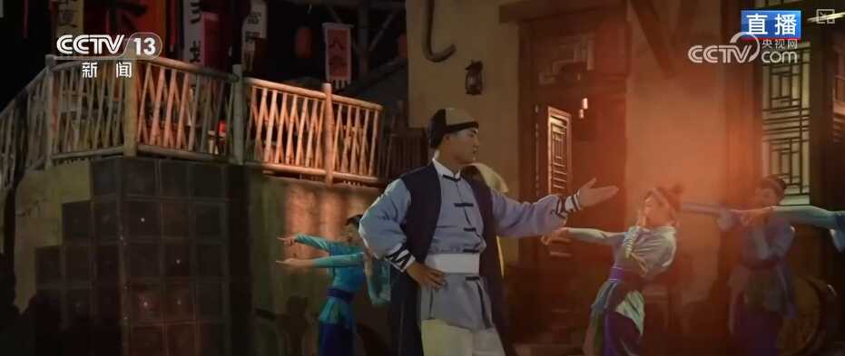 实际上,这处街道只是整场演出中的一幕。游客随演员一路向前,长达1个小时的剧情讲述了百年前一名外国导演来到郑州,寻找太极的故事。其间,会串联起景区的不同场景,比如走过繁华的“老郑州”街道,后面就变成了一个古朴的村落。置景取材于太极拳发源地之一的河南焦作陈家沟,村里既有讲述拜师学艺故事的情景剧,又有以太极功夫编排的舞蹈表演,体现出中原地区的多样历史文化。