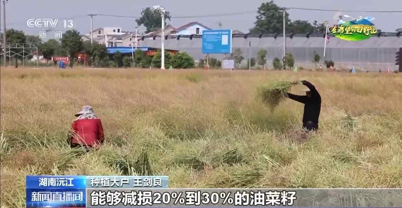 种植大户 王剑良:分段式收割就是先采用人工,把它割下来,放到田里面晒两到三天,然后用收割机收割,再脱粒,能够减损20%到30%的油菜籽。