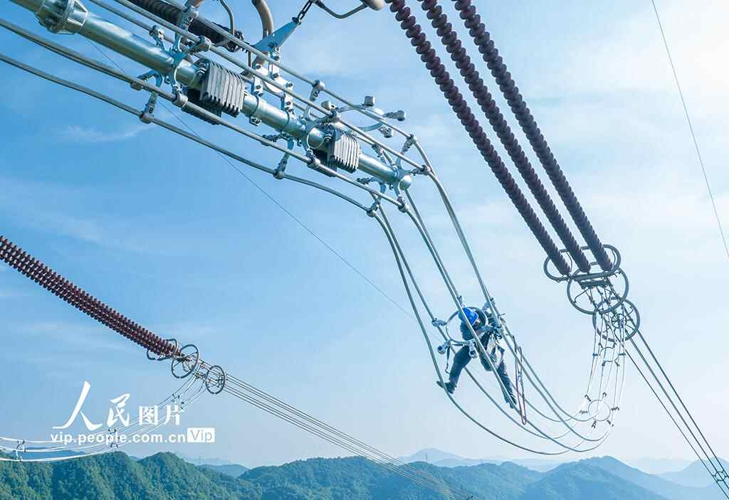 2025年5月12日,在安徽省池州市贵池区殷汇镇±800千伏锦苏特高压直流输电线路检修现场,国网池州供电公司组织施工人员开展高空线路设备检修作业,全力保障"西电东送"特高压输电通道安全稳定运行。贾万田摄(人民图片网)