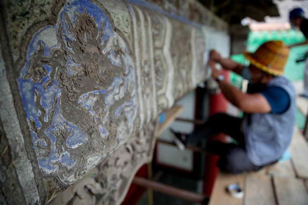 2020年6月30日,工作人员在沈阳故宫进行古建筑油饰彩画保护修复工作。新华社记者 龙雷 摄