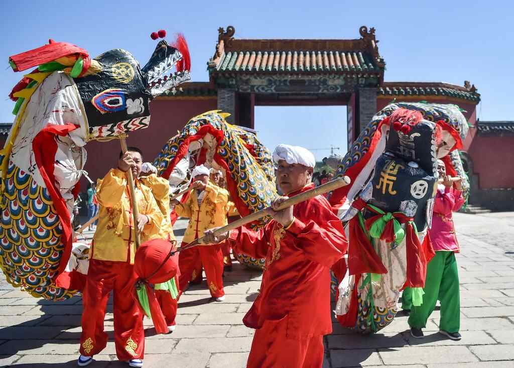 2017年6月10日,张氏皇苑龙舞龙技艺代表性传承人张仲发(前)带队在沈阳故宫表演。新华社记者 龙雷 摄