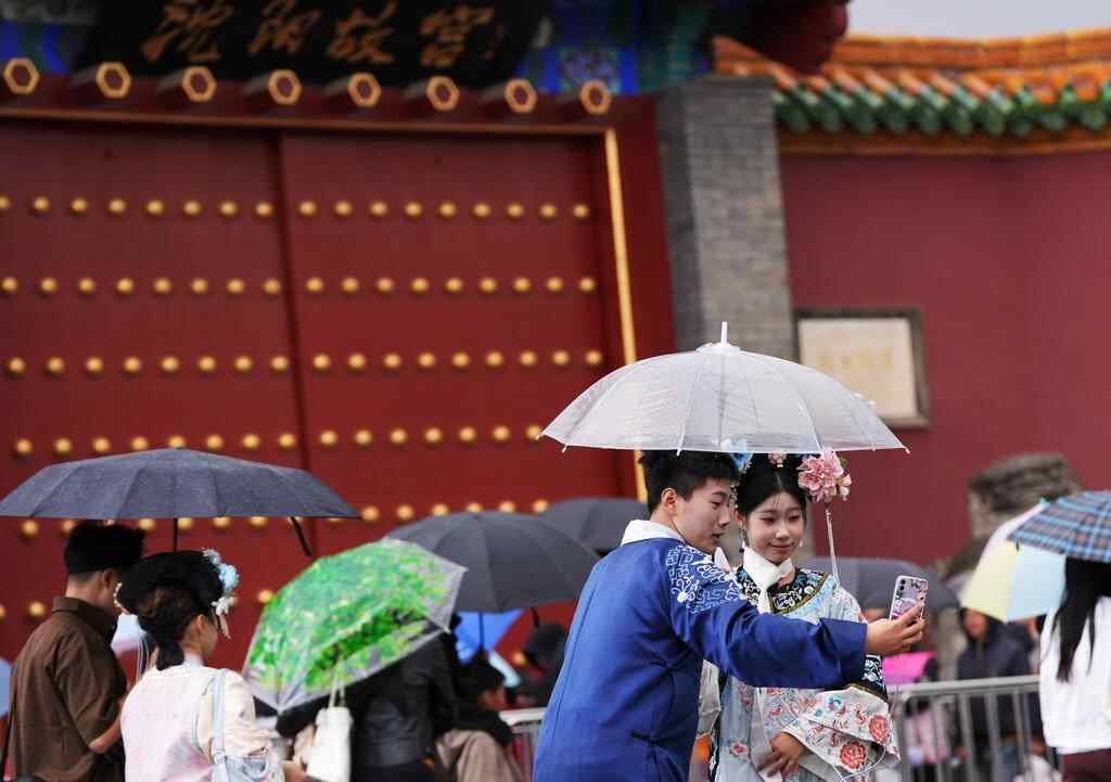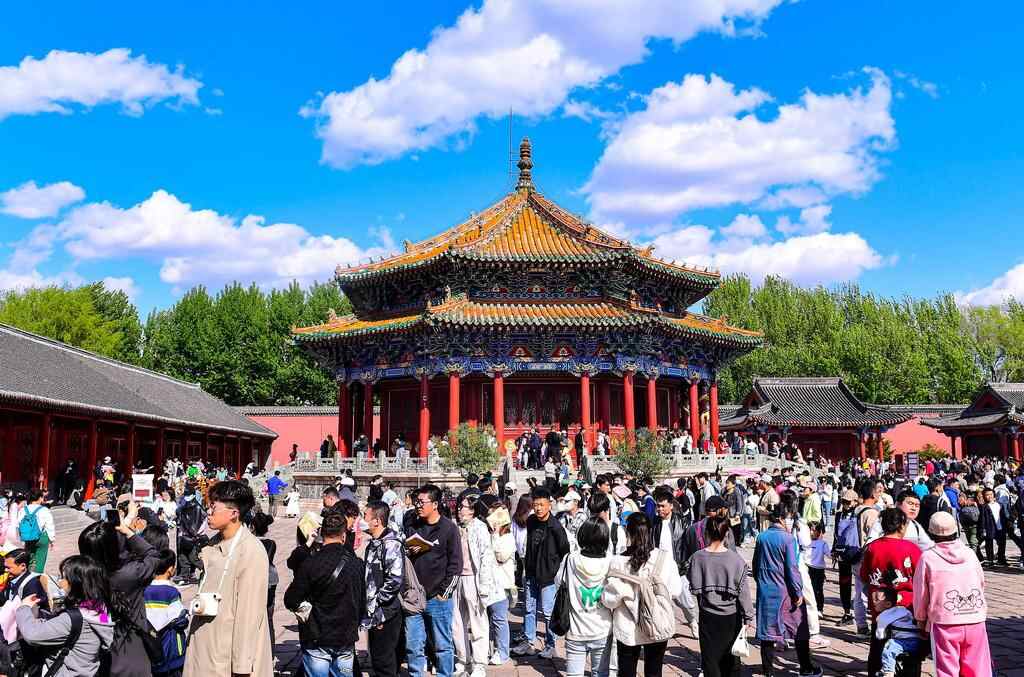 2025年5月3日,游客在沈阳故宫门前打卡拍照。新华社记者 李钢 摄