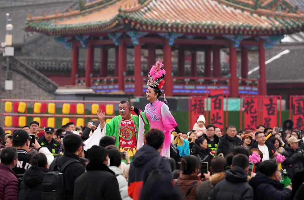 2024年2月24日,演员在沈阳故宫的大政殿前广场表演辽宁海城高跷。沈阳故宫连续多年举办“沈阳故宫过大年”大型文化系列活动。新华社记者 李钢 摄