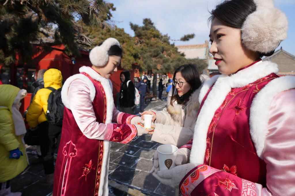 2024年1月21日,沈阳故宫工作人员为游客提供姜糖水和暖贴。新华社记者 李钢 摄
