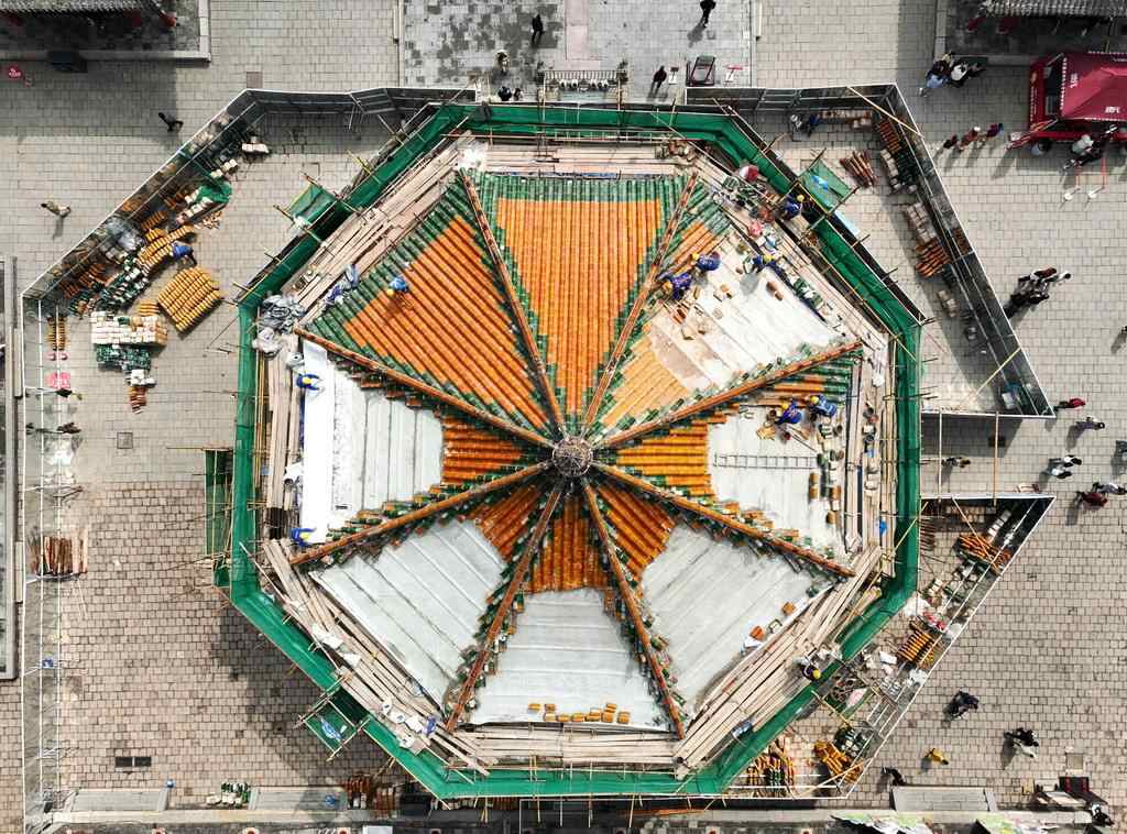 这是2025年4月6日拍摄的保养维护中的沈阳故宫大政殿(无人机照片)。新华社记者 李钢 摄